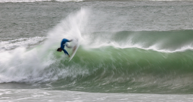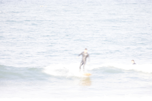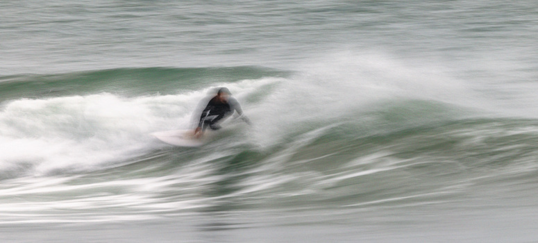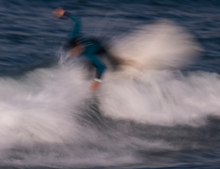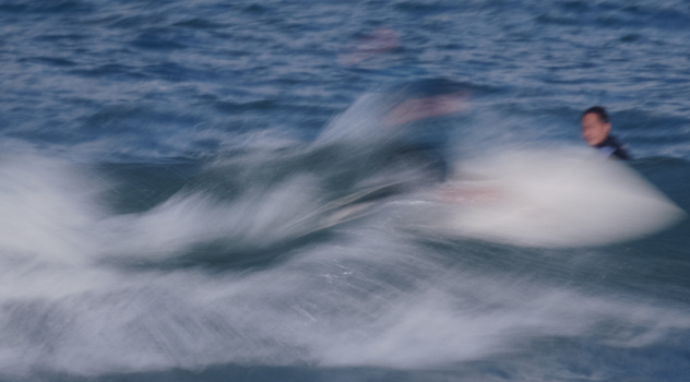Once you’re all set up and you’ve got your settings dialed in, it’s just a matter of pointing and shooting. With this type of photography, the interest really comes from the unusual abstract patterns created on the surface of the water close to the surfer and by the movement of the actual surfers. Therefore, it’s really best to get in as tightly as you possibly can to your subject. When I’m shooting standard types of surf shots for publications, I really like to pull back from the surfer and show the context of the scene from a much wider perspective (entirely in sharp focus), but for this slow shutter type of photography using filters, you really want to get in as tightly as you can to the surfer, the surfboard, and the waves. Here are some example images from this particular day.