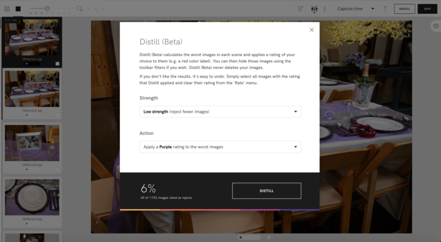 I’ve used this feature with some mixed results. I mainly shoot weddings, which means there are thousands of images and most of them will have multiple faces and be very different from each other. I’ve had images get rejected because the bride’s eyes were closed, but for that photo, it was totally appropriate. Sometimes, I will want an image even if it isn’t perfect because it’s the only shot I got of a guest. In both situations, the Distill feature might not work well.