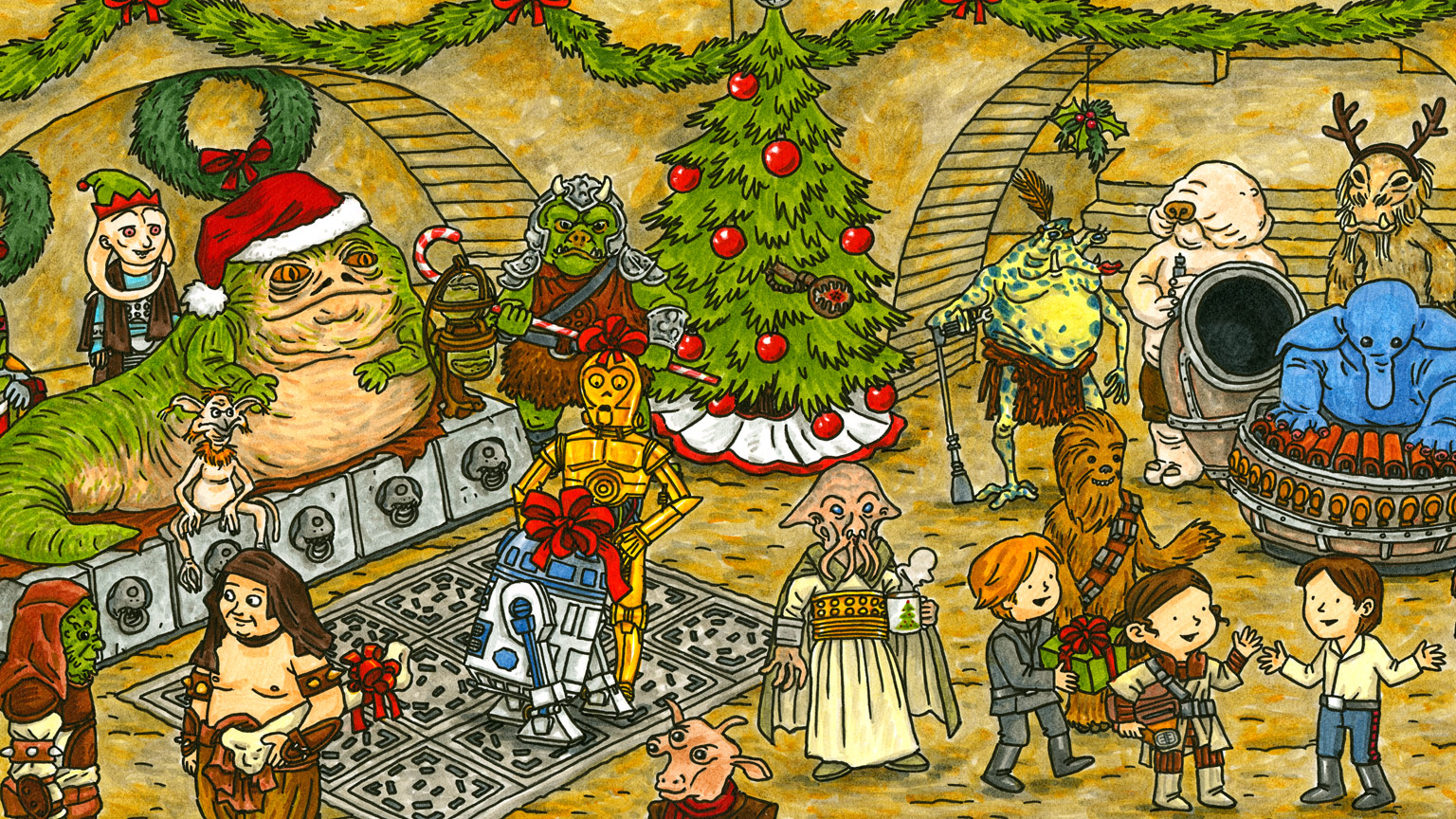 The Hutt’s fearsome guards have exchanged weapons for candy canes. The droids he’s received as a gift from Luke Skywalker are appropriately decked out in red ribbon. Even his favorite decoration, Han Solo, has been freed from his carbonite slumber to mingle with his friends.