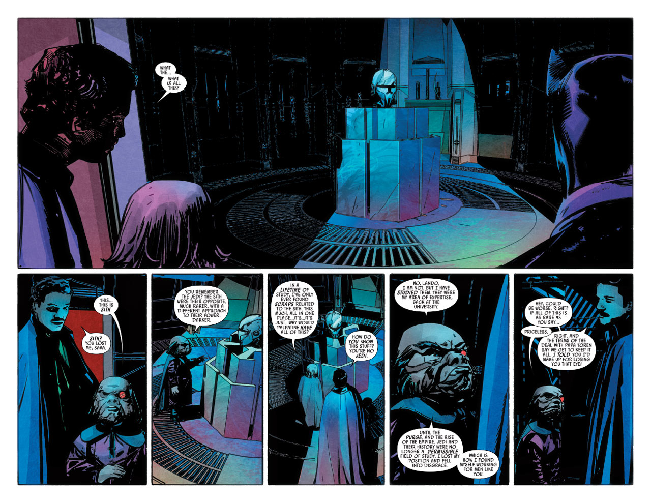 So when I introduced Momin, that was in the very first Star Wars series that I ever did, which was the Lando miniseries. I had no idea if I was ever going to be able to tell anymore Star Wars stuff. So when I did that, I was like, “I’m going to tell the coolest things I can think of, because this might be my only chance to ever do it.” One of those things was a spooky, possessed mask of a Sith Lord that could do some crazy stuff. The extent of the crazy stuff it ended up being able to do, I didn’t know that day, but I knew it felt cool. And I knew that I would dig it as a fan and other fans could hopefully dig it too. And, you know, I had no idea how significant that character was going to become to me, or for many fans, but I’m glad it did.