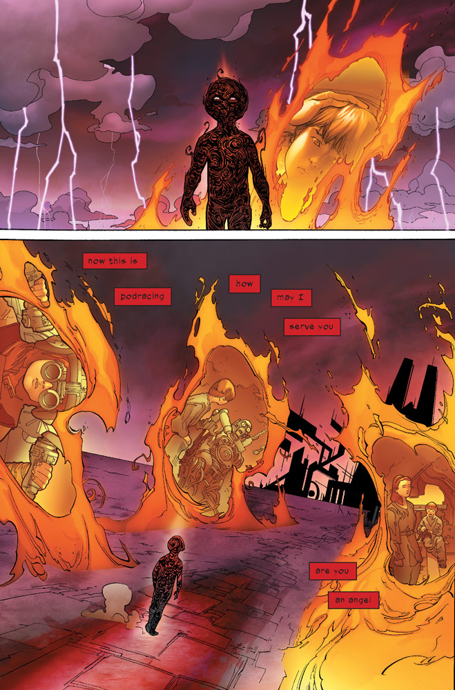 The whole series, up to that point, was giving you all the reasons for Ben’s rage and pain and fear. You saw, on the page, all the things he was angry about, all the things he was afraid of, all the reasons he had all of this inside him. And then it was a very visceral way to dump all of that out, to externalize all of that and put it someplace — into the weapon that he’s then going to use to fight and murder and kill and do all the terrible things Kylo Ren does. So, I knew that bit had to be there. There were some other parts I considered, like I considered stuff with the mask. I considered stuff with other things that Kylo Ren could possibly have done. But to me, bleeding the crystal was the one that was going to get the most kind of character bang for your buck. And Will drew the hell out of it. I think it worked really well.
