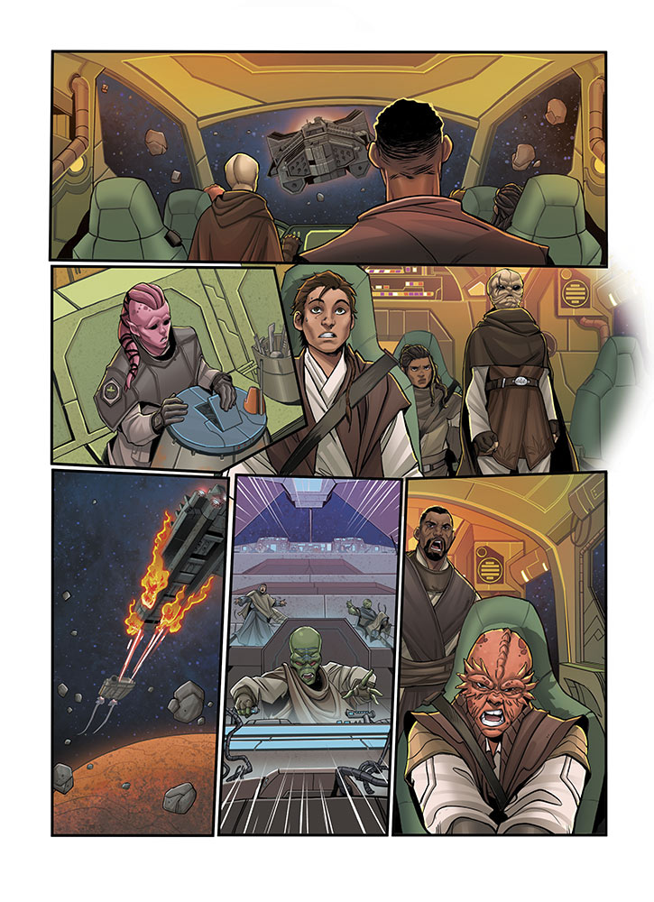 During the Lucasfilm Publishing panel at San Diego Comic-Con this afternoon, creative director and moderator Michael Siglain was joined by eight Star Wars authors — Kristin Baver, Cecil Castellucci, Adam Christopher, Claudia Gray, George Mann, Beth Revis, Cavan Scott, and Kiersten White — reuniting to reveal book and comic covers, comic pages, and interior spreads from Phase II of The High Republic and beyond. Here are 10 reveals and first looks from the hour-long discussion.