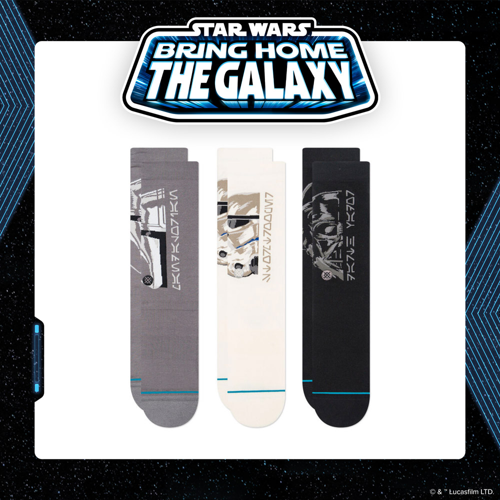 Bring galactic fashion to your sock drawer with this collection, featuring Mando, stormtrooper, and Darth Vader pairs.