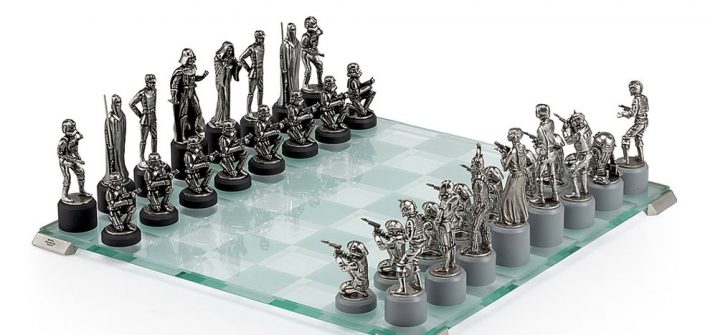 Iconic characters, representing opposing forces from Star Wars Episodes IV, V and VI, face each other across a chessboard of tempered glass, capped by satin finish pewter feet. The embattled Rebel Alliance faces down their menacing Imperial counterparts as pewter chess pieces, enhanced by sleek bonded porcelain plinths in cool grey and matt black respectively.